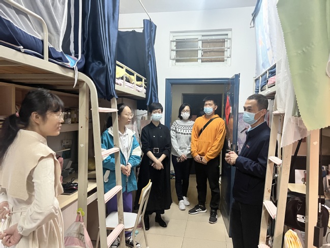走访过程中,学院领导与同学们进行了亲切的交流,进一步了解同学们在学习、生活和心理上的困难,及时排忧解难。余顺兴叮嘱同学们们一定要调节身心状态,合理规划时间,养成良好的学习和生活习惯,注意个人健康,加强体育锻炼,并鼓励同学们做好未来规划,提高抗压能力,积极主动学习;强调同学们一定要提高思想认识,理解并自觉遵守学校疫情防控管理规定,做好全员核酸,科学防护,保持健康的心态,树立大局意识和全局意识,争做新时代新青年,共同营造安全有序的校园环境。