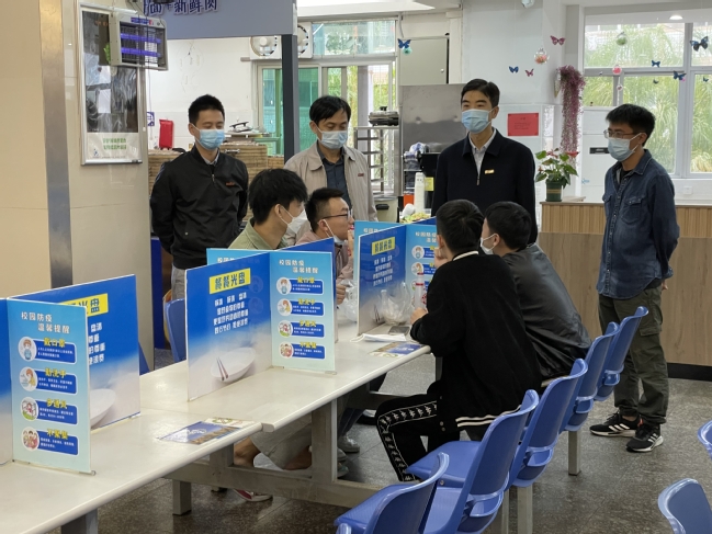 11月4日,林庆藩副校长在校纪委综合室、后勤管理处负责人的陪同下,对食堂、环境卫生、水电设施、物资接驳、东苑学生接驳、学生居校健康观察点等进行实地走访,检查指导校园封闭管理期间疫情防控后勤各项保障工作情况。