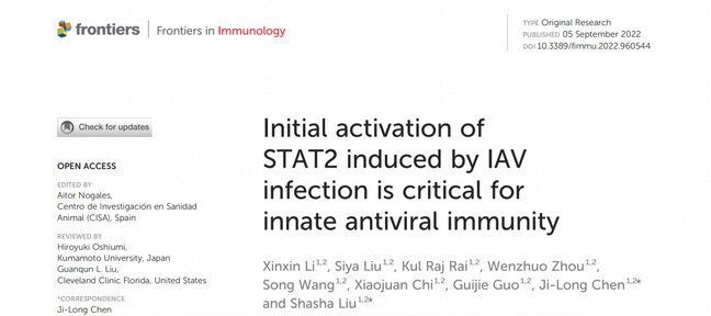 2022年9月5日,陈吉龙教授团队在国际免疫学领域重要期刊《Frontiers in Immunology》发表题为“Initial activation of STAT2 induced by IAV infection is critical for innate antiviral immunity”的研究论文。该研究发现流感等病毒感染早期诱导STAT2的磷酸化不依赖于I型干扰素和JAK激酶,而是主要受到RIG-I/MAVS信号通路的调控。机理性研究表明,MAPK12和Syk是参与调节流感病毒感染引发STAT2早期磷酸化的关键激酶。抑制MAPK12激酶的活性,明显抑制病毒感染早期诱导抗病毒基因的表达,从而促进流感病毒在宿主细胞中的复制。该研究揭示在流感病毒感染早期存在一种不依赖于细胞因子的抗病毒天然免疫应答机制,为阐明天然免疫系统抵抗病毒感染的机制提供了创新性知识,也为寻找新的抗流感病毒药物靶标提供了新思路。
