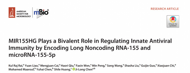 2022年11月2日,陈吉龙教授团队在国际微生物学领域权威期刊《mBio》上在线发表题为“MIR155HG Plays a Bivalent Role in Regulating Innate Antiviral Immunity by Encoding Long Noncoding RNA-155 and microRNA-155-5p”的研究论文。通过动物模型研究发现,敲除lncRNA-155的宿主与敲除miRNA-155的宿主相比,对流感病毒或伪狂犬病毒感染更加易感,表明lncRNA-155除了通过产生miRNA-155发挥功能之外,在调控流感等病毒发病过程中存在其他作用机制。进一步研究证明了miRNA-155-5p通过促进STAT1的激活而增强抗病毒反应,但不能直接调控干扰素的表达。然而,lncRNA-155可以通过调节干扰素调节因子3(IRF3)的激活,促进病毒诱导IFN-β的产生。这些研究揭示了MIR155HG基因通过编码lncRNR-155和miRNA-155-5p在抗病毒天然反应中发挥双重调控作用,为阐明动物病毒与宿主互作机制提供重要的科学依据,为抗病毒技术研发提供理论基础。