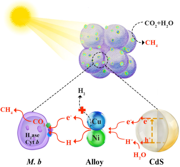 微生物光电产甲烷是一种新型的微生物产甲烷模式,即产甲烷菌利用半导体(矿物)等光活性物质产生的还原力(光生电子、氢气等)进行自养代谢产甲烷。其中,生物-无机界面是微生物光电产甲烷的核心。然而目前,关于界面电子/质子传递及其能量转移机制尚缺乏深入研究。周顺桂教授团队在《Nature Communications》发表题为“Solar-driven methanogenesis with ultrahigh selectivity by turning down H2 production at biotic-abiotic interface”的研究论文。该研究通过构建Methanosarcina barkeri (M. b)-NiCu@CdS微生物光电化学产甲烷系统,首次证实双活性位点能够调控界面产氢并通过M. b胞外和胞内的氢循环促进甲烷生成。相关研究成果突破了微生物光电产甲烷以氢气作为主要电子供体的传统认识局限,对于深入认识产甲烷菌的能量利用和转化过程具有重要意义。