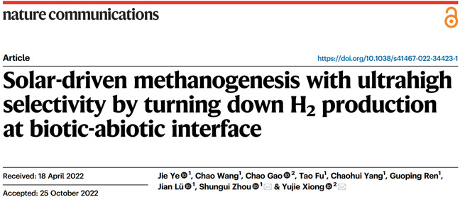 微生物光电产甲烷:生物-无机界面产氢调控驱动超高选择性产甲烷