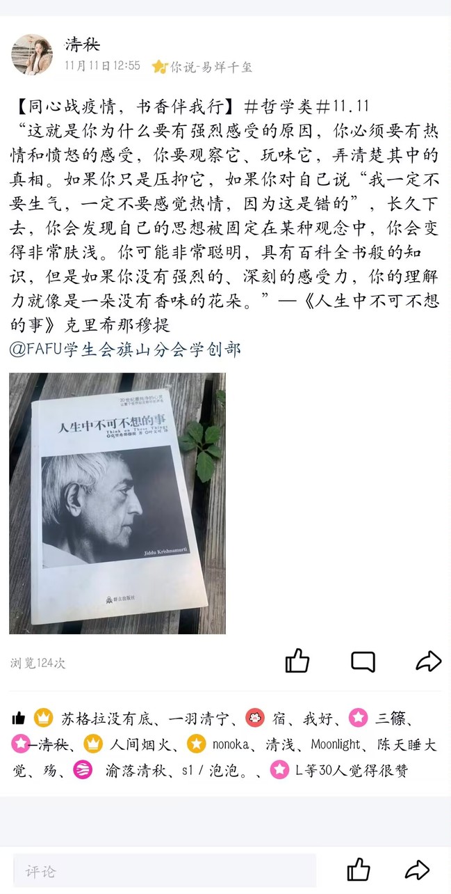 活动结束后,同学们纷纷表示,通过参与每日不同主题的读书打卡活动,不仅丰富了他们的精神文化生活,也扩大他们的视野,在校园逐步形成以读书求新知,以读书促进步,以读书促和谐的良好局面,用文化的力量凝聚起师生齐心协力抗击疫情的信心。