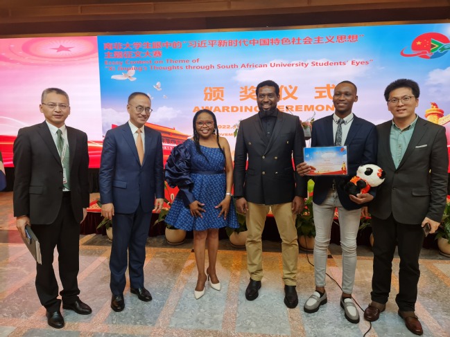 陈晓东向获奖者致以热烈祝贺,充分肯定了南非高校学生学习习近平新时代中国特色社会主义思想的热情。他表示,在两国元首共同引领下,中南全面战略伙伴关系深入发展。明年中南两国将迎来建交25周年,南方还将接棒金砖主席国,两国关系发展迎来新契机。中南关系的未来和友谊赓续掌握在两国有为青年手中,希望各位学子努力做中南世代友好的践行者和传承者,为推动构建中南、中非命运共同体作出应有贡献。
