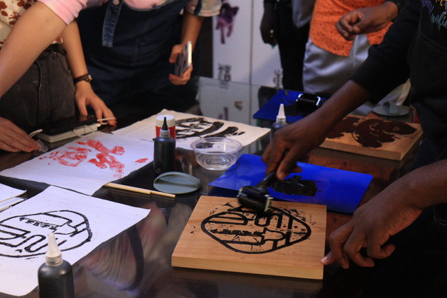 留学生们一起拓印福习社图标