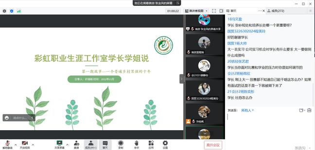 11月22日晚,经济与管理学院彩虹职业生涯工作室召开第一期“学长学姐说”线上交流会,共有三百余人参与本次活动。