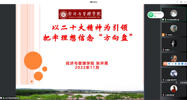 11月19日-22日,经济与管理学院党委全体委员身体力行,将自己前期自学、研讨党的二十大报告的心得进行分享,分专题宣讲“五个牢牢把握”,扎实推动党的二十大精神在学院落地见效。经济与管理学院、乡村振兴学院发展对象班全体学员参加。
