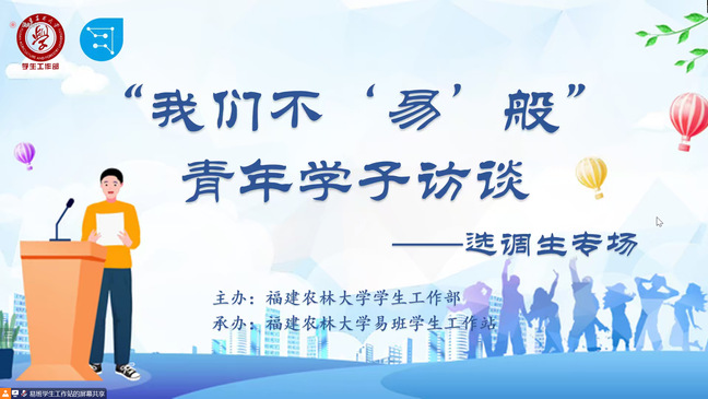 11月27日晚,由学工部主办、校易班学生工作站承办的“我们不‘易’般”青年学子访谈之选调生专场交流在云端顺利举办。邀请在基层岗位上淬炼成长的选调生校友郑子峰、高德星、蔡晓乐、余方舟伟进行选调生报考及基层工作经验交流分享。学工部就业指导科刘婷老师就选调生报考指南及政策解读进行了现场解读。