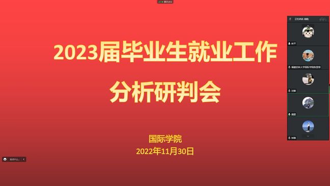 11月30日,国际学院召开2023届毕业生就业工作分析研判会,院党政领导班子成员、系部主任及政工干部参加会议,会议由院长吴锦程主持。