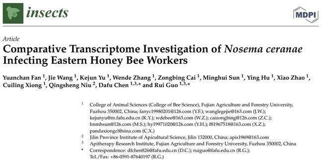 (4)在《Insects》发表题为“Comparative transcriptome investigation of Nosema ceranae infecting eastern honey bee workers”的研究论文,解析东方蜜蜂微孢子虫在侵染东方蜜蜂工蜂过程的转录组动态及潜在侵染机制。郭睿副教授为通讯作者,硕士生陈华枝、博士生范小雪为共同第一作者。