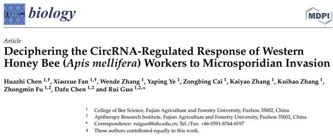 (3)在《Biology》发表题为“Deciphering the crcRNA-regulated response of western honey bee (Apis mellifera) workers to microsporidian invasion”的研究论文,首次解析西方蜜蜂工蜂响应东方蜜蜂微孢子虫侵染的circRNA差异表达谱及调控网络后,并揭示差异circRNA调控侵染的潜在功能及作用机制。郭睿副教授为通讯作者,硕士生陈华枝、博士生范小雪为共同第一作者。