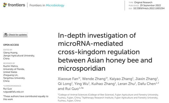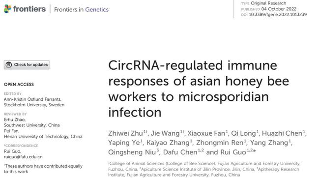 我校陈大福教授、郭睿副教授团队(校硕士生导师团队、青年五四奖章集体)近期在非编码RNA调控蜜蜂与病原的相互作用机制领域取得系列研究进展,先后在《Frontiers in Microbiology》(JCR Q1区,Top期刊,IF=6.064),《Frontiers in Genetics》(JCR Q1区,IF=4.772), 《Biology》(JCR Q1区,IF=5.168),《Insects》(JCR Q1区,IF=3.141),《生物工程学报》(中文卓越期刊),《微生物学报》(中文卓越期刊),《菌物学报》(中文权威期刊)和《昆虫学报》(中文权威期刊)等期刊发表11篇学术论文。