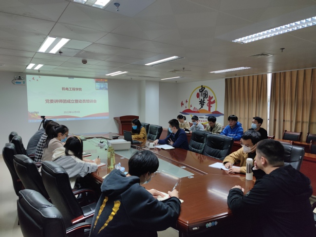 12月4日上午,机电工程学院党委学习贯彻党的二十大精神师生宣讲团成立仪式暨动员培训会以线上线下相结合方式在旗山校区综合楼718会议室举行。学院党委副书记(主持工作)修新田,辅导员,支部书记等参加会议。会议由学院党委副书记杨莹主持。