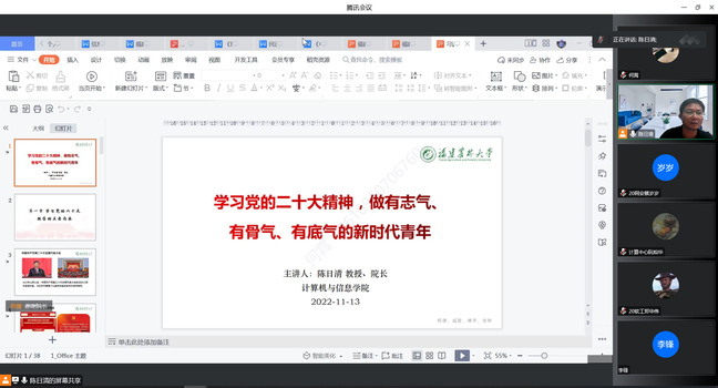 学院院长陈日清教授、副院长鲍玲鑫副教授、关工委副主任张朝阳、党政办主任廖云茜、组织员张文元和辅导员林黄敏分别为培训班学员讲授《建设科技强国,增强做中国人的志气、骨气、底气》《把青春奋斗融入党和人民的事业》《坚守初心,砥砺奋进》《坚定信念跟党走,奋勇争先担使命》《学习党的二十大精神》《中国共产党简史》专题内容;同时,通过开云网页版易班在线学习平台,组织预备党员学习了《党的二十大报告解读》《<习近平谈治国理政>第四卷》《中国共产党何以引领中华民族复兴伟业》《中华民族伟大复兴与中国共产党》《同心共筑中国梦》《誓言》等内容,开展了“分享学习党的二十大精神心得”为主题的小组讨论和防疫志愿服务活动。