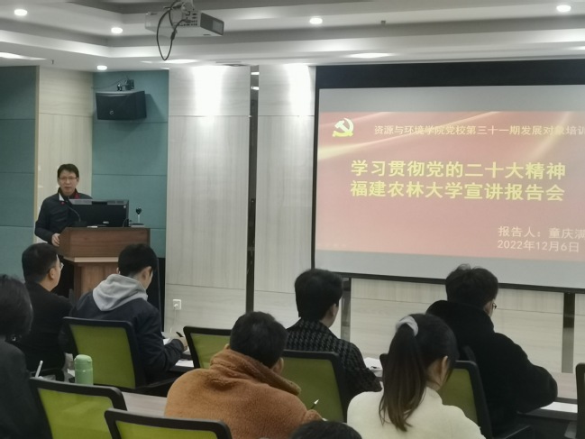 近日,资源与环境学院党校第三十一期发展对象培训班在田家炳楼C611举行学习贯彻党的二十大精神宣讲报告会,全班64名师生学员参加,宣讲会由校党委讲师团成员、学院党委书记童庆满,学院党委副书记林惠科主讲。