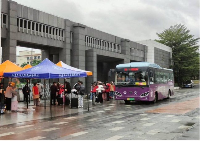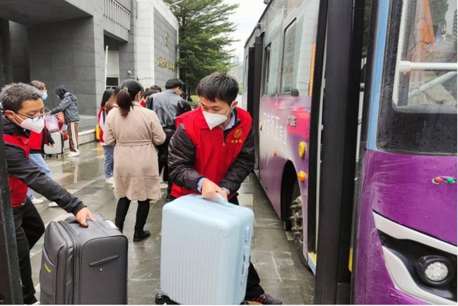 学院辅导员精准摸排返乡学生离校时间、人数、行程等信息,合理安排车辆班次。学院行政人员和学生志愿者们在宿舍门口和校门口组织学生有序上车,及时调配车辆,确保学生顺利离校。