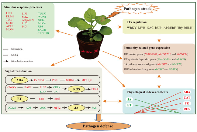 稳定遗传转化和转录组分析表明,ShAOS1基因的过表达能够通过调控大量转录因子(transcription factors,TFs)、蛋白激酶(protein kinases,PKs)、一系列的刺 激反应过程以及活性氧(reactive oxygen species,ROS)、超敏反应(hypersensitive response,HR)、茉莉酸、乙烯(ethylene,ET)和脱落酸(abscisic acid,ABA)等信号通路的表达,增强转基因株系对病原菌胁迫的抗性(图1B和1C)。最后,综合表型、生理和分子三个维度,作者构建了甘蔗ShAOS1基因在植物抗病防御反应中的调控机制模型(图2)。