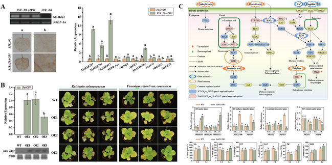 甘蔗(Saccharum spp.)是世界上最重要的糖料和能源作物。甘蔗病害,尤其黑穗病,严重影响甘蔗的产量和品质。茉莉酸生物合成途径中的丙二烯氧化物合成酶(allene oxide synthase,AOS,EC 4.2.1.92),是一种典型的细胞色素P450酶,在增强植物对外界环境适应性方面发挥重要作用。研究从甘蔗野生种割手密和热带种的基因组入手,聚焦甘蔗AOS基因家族的挖掘、分类、进化、结构特征、启动子顺式作用元件、表达模式、抗病功能及其调控机制解析开展研究。进一步,作者从甘蔗栽培种中克隆获得一个ShAOS1基因(GenBank Accession Number:MK674850)。该基因编码一个定位于质膜的非分泌性的酸性稳定亲水性9/13-AOS蛋白,在甘蔗对茉莉酸甲酯(methyl jasmonate,MeJA)、水杨酸(salicylic acid,SA)和脱落酸(abscisic acid,ABA)胁迫的响应中发挥积极作用。研究还发现,ShAOS1基因的瞬时过表达可促进过氧化氢(hydrogen peroxide,H2O2)的积累,并诱导免疫相关基因的表达(图1A)。
