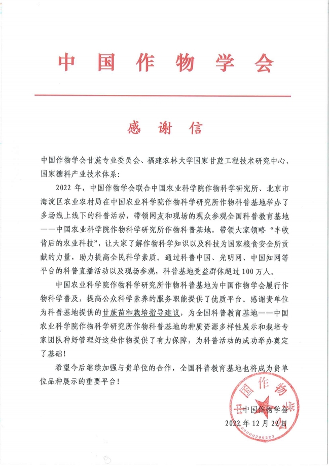近日,中国作物学会向依托我校的甘蔗专业委员会、国家甘蔗工程技术研究中心等单位发来感谢信,高度赞赏我校为全国科普教育基地提供甘蔗种苗以及栽种指导建议,为中国农业科学院作物科学研究所科普基地的种质资源多样性展示和栽培专家团队种好管理好这些作物提供了有力保障,为全国科普日云游活动的成功举办奠定了基础。中国作物学会已连续三年发来感谢信。