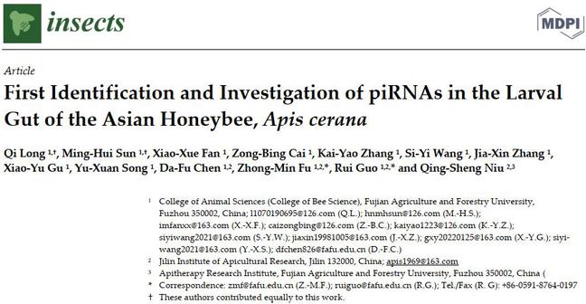 (3)在国际昆虫学期刊《Insects》发表题为“First Identification and Investigation of piRNAs in the Larval Gut of the Asian Honey Bee, Apis cerana”的研究论文,首次解析中蜂工蜂幼虫肠道发育过程piRNA的差异表达谱及调控网络,并揭示piRNA参与调控肠道发育的潜在作用。郭睿副教授、付中民讲师为共同通讯作者,硕士生隆琦、孙明会为共同第一作者。