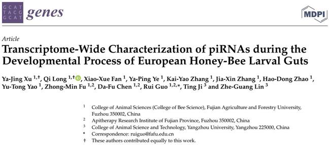 (4)在国际遗传学期刊《Genes》发表题为“Transcriptome-wide Characterization of piRNAs During the Developmental Process of European Honey Bee Larval Guts”的研究论文,首次解析西方蜜蜂工蜂幼虫肠道发育过程piRNA的差异表达谱及调控网络,并揭示差异piRNA通过调控靶基因表达潜在参与调节肠道发育。郭睿副教授为通讯作者,硕士生许雅静、隆琦为共同第一作者。