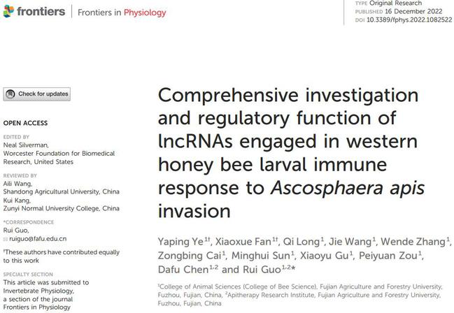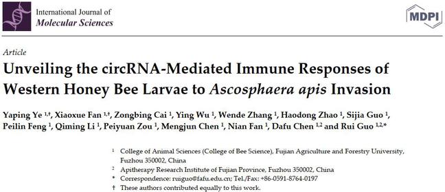 近期,我校陈大福教授、郭睿副教授团队在蜜蜂非编码RNA调控蜜蜂-病原互作机制及蜜蜂肠道发育机理领域取得系列研究进展,先后在《International Journal of Molecular Sciences》(JCR Q1区,Top期刊,IF=6.208),《Frontiers in Physiology》(JCR Q1区,Top期刊,IF=4.755),《Insects》(JCR Q1区,IF=3.141),《Genes》(JCR Q2区,IF=4.141),《中国农业科学》(中文卓越期刊)和《昆虫学报》(中文权威期刊,5篇)发表10篇学术论文。