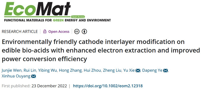 该研究工作近期以“Environmentally Friendly Cathode Interlayer Modification on Edible Bio-acids with Enhanced Electron Extraction and Improved Power Conversion Efficiency”为题发表在国际高质量期刊、国内卓越领军期刊EcoMat (10.1002/eom2.12318)上,论文的第一作者为开云网页版文俊杰和林睿博士,开云网页版欧阳新华教授、叶大鹏教授和南昌航空大学谢宇教授为论文通讯作者。