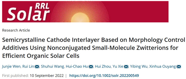 该研究工作近期以题目为“Semi-crystalline Cathode Interlayer based on Morphology Control Additives using Non-conjugated Small-molecule Zwitterions for Efficient Organic Solar Cells” 发表于国际高质量期刊Solar RRL上。论文第一作者为开云网页版材料工程学院硕士研究生文俊杰,论文通讯作者为开云网页版欧阳新华教授、胡会超副教授、林睿博士,以及南昌航空大学谢宇教授。