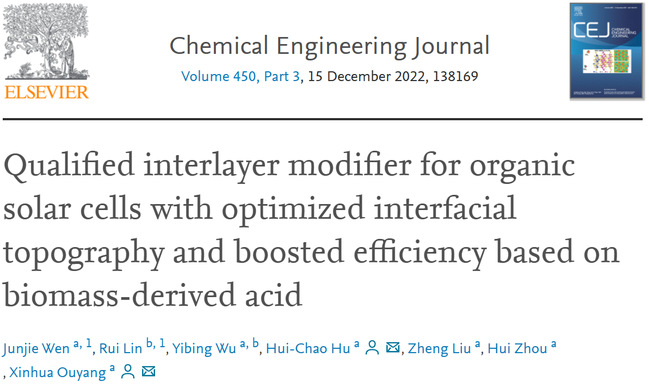 论文近期以题目为“Qualified Interlayer Modifier for Organic Solar Cells with Optimized Interfacial Topography and Boosted Efficiency based on Biomass-Derived Acid”发表于国际高质量期刊Chemical Engineering Journal(2022,450,138169)上,论文第一作者为材料工程学院硕士研究生文俊杰和机电工程学院林睿博士,论文通讯作者为开云网页版欧阳新华教授和胡会超副教授。
