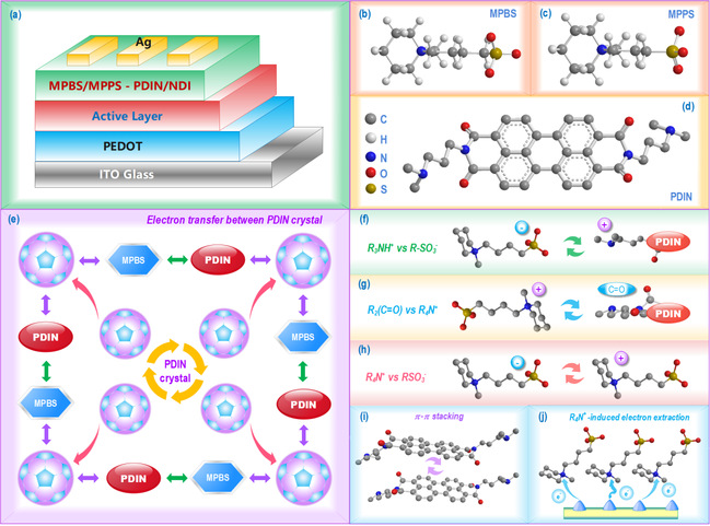 图3.(a)器件结构;三维立体分子结构,(b)MPBS(c)MPPS,(d)PDIN;(e)基于双亲盐阴极界面电子传输示意图;(f-g)MPBS与PDIN间的静电作用;(i)PDIN分子π-π堆叠示意图;(j)MPBS分子对电子的提取示意图。