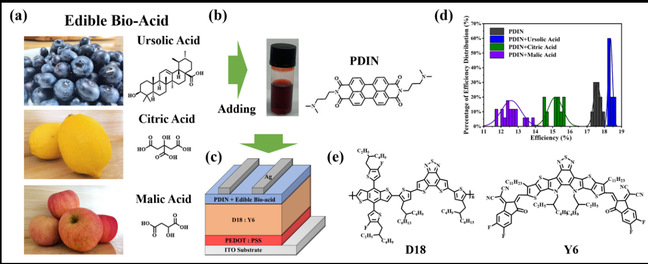 图2.(a) 熊果酸、柠檬酸和苹果酸的来源及分子结构;(b) PDIN的结构及溶解性;(c) 有机太阳能电池结构;(d) 电池效率分布图;(e) 有机太阳能电池活性层分子结构