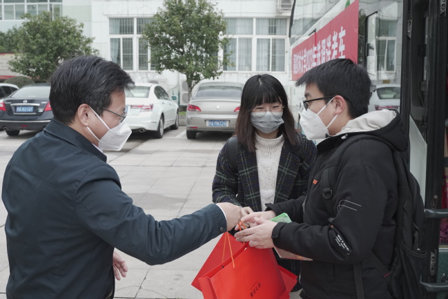 出发前,校党委书记王建南、副书记柯瑞清、副校长郑宝东一行来到送站点,为赴考学子送行。王建南与考生们亲切交谈,帮助他们调节心态,为他们加油打气,祝福他们考试顺利,并亲手赠送了含有牛奶、橙子、消毒湿巾等暖心加油包,希望考生们“牛”气冲天、心想事“橙”。
