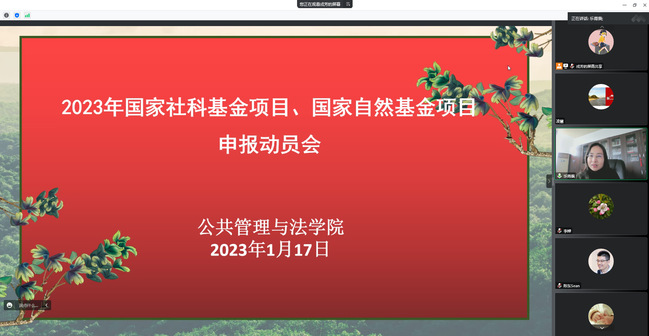 为做好2023年度国家社科基金项目和国家自科基金项目的组织申报工作,1月17日下午,公共管理与法学院以腾讯会议线上的方式召开项目申报动员暨专家辅导会。院长阮晓菁主持会议,160多名师生参加了会议。
