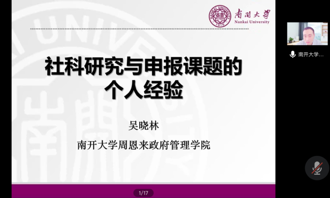 南开大学周恩来政府管理学院副院长、全国公共管理专业学位研究生(MPA)教指委委员吴晓林教授做了《社科研究与课题申报的个人经验》辅导报告。他根据自身丰富的研究经验,从选题与破题、内容与重点、队伍与团队、基础与条件、创新与亮点、结构与逻辑、形式与细节等七个方面对国家课题申报进行了系统指导,让师生们受益匪浅。