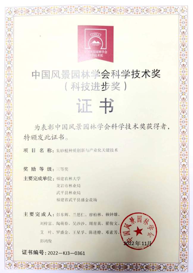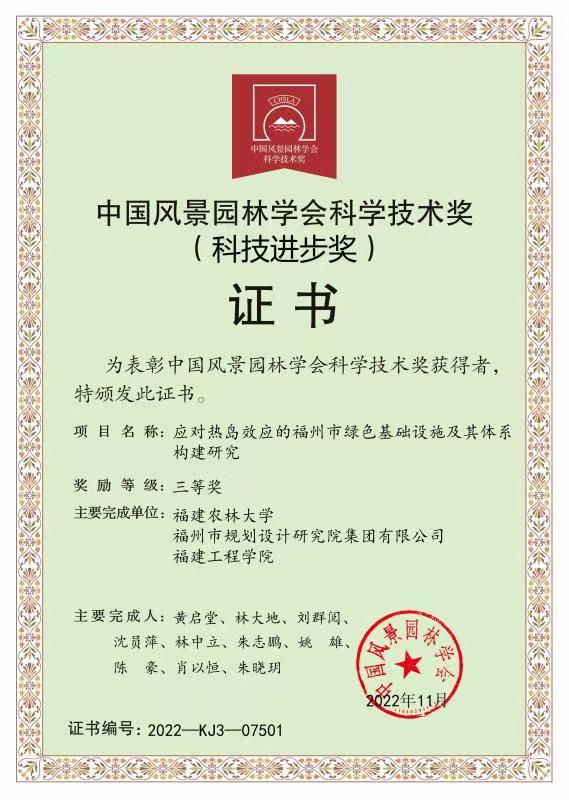 风景园林与艺术学院黄启堂教授主持的“应对热岛效应的福州市绿色基础设施及其体系构建研究”和彭东辉教授支持的“朱砂根种质创新与产业化关键技术”两项科技成果荣获2022年度中国风景园林学会科技进步三等奖。以上两项科技成果分别在城市绿色基础设施体系的完善及乡村振兴方面取得显著的经济社会效益。