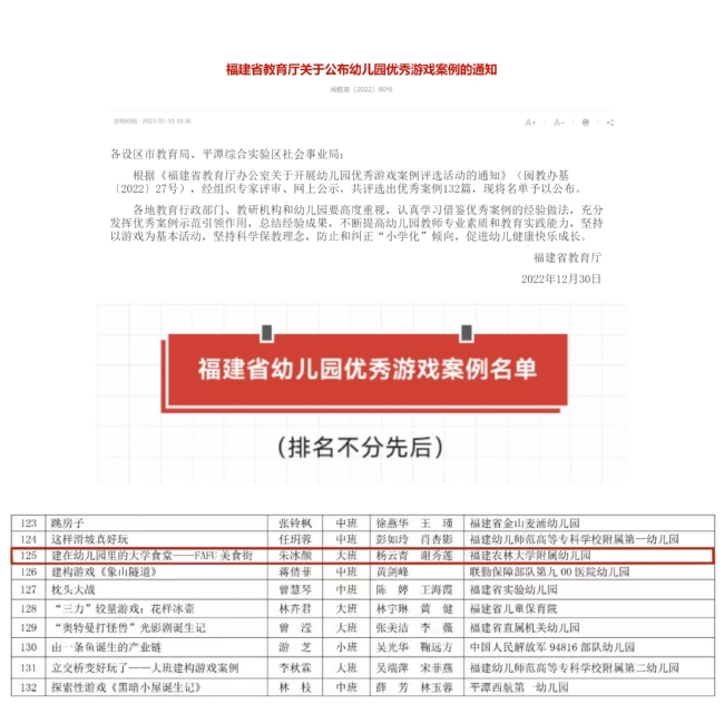 近日,我校附属幼儿园教师朱冰颜撰写的游戏案例《建在幼儿园里的大学食堂——FAFU美食街》(指导老师杨云青、谢秀莲)参加《福建省教育厅办公室关于开展幼儿园优秀游戏案例评选活动的通知》(闽教办基【2022】27号)的评选,全省共评选出132篇幼儿园优秀案例,我园该游戏案例喜获“2022年福建省幼儿园优秀游戏案例”。