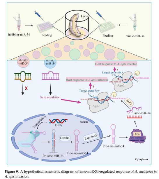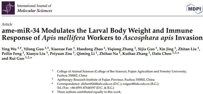 (2)在国际生物化学与分子生物学领域重要期刊《International Journal of Molecular Sciences》发表题为“ame-miR-34 Modulates the Larval Body Weight and Immune Response of Apis mellifera Workers to Ascosphara apis Invasion”的研究论文,综合运用多种分子生物学方法对西方蜜蜂(Apis mellifera)的ame-miR-34进行功能探究,首次在分子水平深入揭示ame-miR-34参与调控西方蜜蜂工蜂幼虫体重及幼虫对蜜蜂球囊菌侵染的免疫应答。研究结果白垩病诊疗提供了有前景的新型生物标志物和分子靶点。陈大福教授、郭睿副教授为本文共同通讯作者,硕士生吴鹰、郭意龙为共同第一作者。本文是吴鹰硕士(2020级)作为第一作者继《菌物学报》、《昆虫学报》(2篇)和《应用昆虫学报》后发表的第5篇学术论文,也是郭意龙硕士(2019级)作为第一作者继《微生物学报》、《昆虫学报》和《环境昆虫学报》后发表的第4篇学术论文。