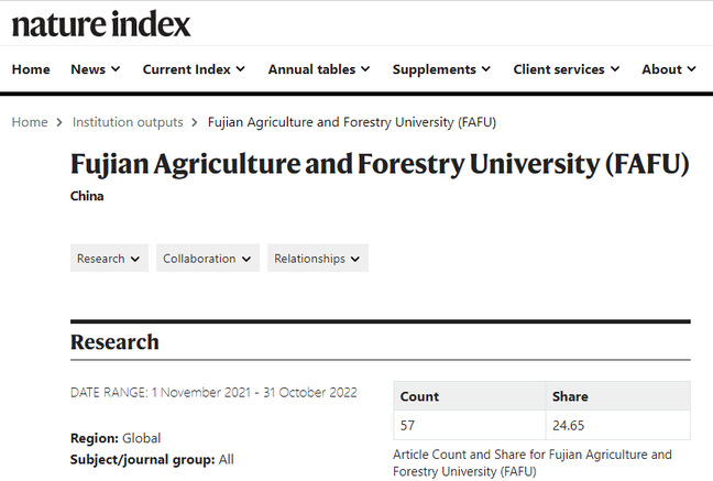 我校生命科学在自然指数内地高校排行中位列第29,在国内农林高校中位列第5,位于中国农业大学、华中农业大学、西北农林科技大学、南京农业大学之后,省内高校仅次于厦门大学,在全球学术机构中位列第217。地球与环境科学在自然指数内地高校排行中位列第48,在国内农林高校中位列第4,位于西北农林科技大学、南京农业大学、华中农业大学之后,省内高校仅次于厦门大学,在全球学术机构中位列第194。