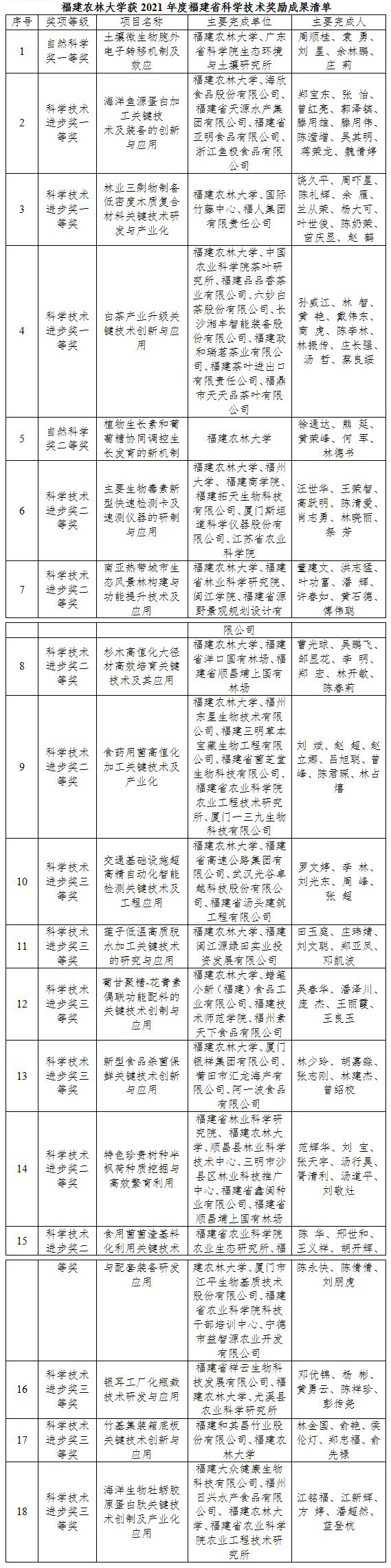 近日,省政府公布《福建省人民政府关于2021年度省科学技术奖励的决定》(闽政文〔2023〕75号),我校有18项成果(含合作5项)获省科学技术奖奖励(含福建省自然科学奖2项、福建省科学技术进步奖16项),其中一等奖4项,二等奖7项(含合作2项),三等奖7项(含合作3项),具体获奖成果清单附后。