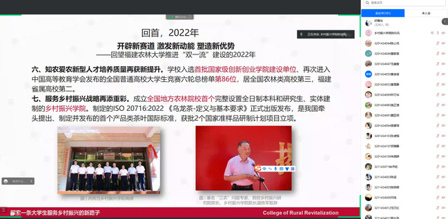 全力上好“开学第一课”。2月11日-13日,学院以理想信念教育为中心,围绕学生思想教育和安全健康教育两个关键,组织开展“开学第一课”系列活动。2月12日晚,学院分研究生、本科生2个场次,先后召开“乡村振兴学院2023年春季开学第一课暨学生工作腾讯视频会议”,全体学生线上参与。会议就疫情防控政策调整的成效、网络空间西方价值渗透的手法等六个模块的开展线上教育。陈玲凤以《新学期、新希望、新征程》为题,对学院2022年的学生工作做了回顾,立足2023年对学生工作做出了部署,同时在学院优势、社会实践、职业规划、就业创业等四个方面展开分析。勉励乡村振兴学子在新学期踔厉奋发,砥砺前行,争做学院历史的创造者、亲历者。