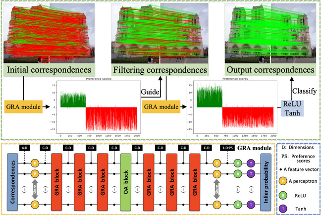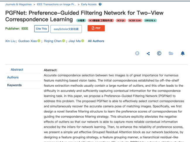 近日,我校计算机与信息学院陈日清教授团队在IEEE Transactions on Image Processing国际期刊(中国计算机学会推荐CCF A 类,中科院一区,SCI影响因子IF=11.04,DOI:10.1109/TIP.2023.3242598)在线发表题为“PGFNet: Preference-Guided Filtering Network for Two-View Correspondence Learning”的研究论文。此项研究提出了一种偏好引导过滤网络(简称PGFNet)去显式地减轻大量错误匹配对于深度神经网络学习的负面影响,从而获得更准确的特征匹配结果。实验表明,本研究所提出的 PGFNet 在公开数据集的误匹配移除和相机姿态估计任务等方面具有明显的优势。