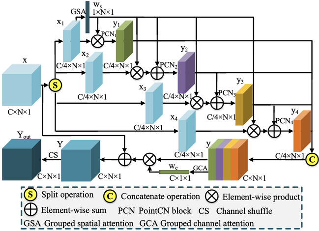 初始特征匹配集合中通常包含大量错误匹配,它们会严重地阻碍神经网络捕获准确和充分的上下文信息,从而影响后续基于特征匹配任务的实施。然而先前方法使用基于多层感知器操作或注意力机制的方法很难避免大量错误匹配对网络学习的影响。因此,PGFNet设计了一种迭代过滤的网络结构,通过学习匹配的偏好分数(作为正确匹配的可能性)去渐进地提取更可靠的候选匹配用于后续网络学习,如图1所示。同时,PGFNet提出了一个简单但有效地网络骨干结构(分组残差注意力块,如图2所示),通过一系列新的操作去提升偏好分数的可靠性,从而获得更好的网络性能。