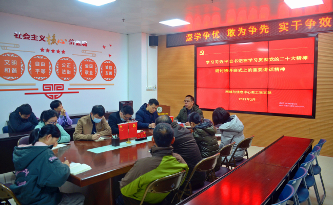 近日,网络与信息中心教工党支部召开专题学习会,学习习近平总书记在学习贯彻党的二十大精神研讨班开班式上的重要讲话精神,支部书记、信息中心主任曾海滨主持学习会,全体党员参加。