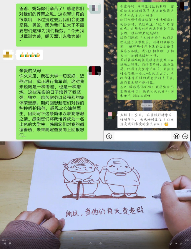 发一条感恩父母的信息。军训期间,同学们通过短信、微信、qq等多种形式向父母讲述了军训期间的经历和收获。“感谢你们的养育之恩,这次军训真的很累哦!不过挺过去后我们会更加坚强、勇敢。”“这些充实的日子培养了我坚强、独立、吃苦耐劳以及强烈的集体荣誉感。期间想起您们对我的种种呵护陪伴,感恩之心油然而生。”“军训虽然很艰辛,但是让我变得自律……感恩父母、感恩学校、感恩祖国。”学院动员各班拍摄制作了多条感恩父母的短视频作品,其中包含手绘等创意元素,鲜活生动、情感细腻,具有良好的传播力和感染力。
