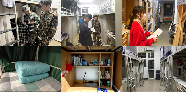举行一次文明宿舍评比活动。为做好评比前的准备工作,2022级辅导员同连队教官深入部分学生宿舍,现场指导学生进行内务整改,并向同学们发送了内务标准照片和参考视频。学院卫检部、保卫部、自律会多部门联动,将军训内务整理规范与学院原有文明宿舍评比项目相融合,对2022级55间本科新生宿舍进行检查打分,最终按照3%的比例评选出军训文明宿舍2间。本次评比活动有效提升了同学们的劳动素养,营造了更加干净、整洁、健康的宿舍环境,为文明校园创建添砖加瓦。