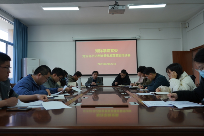 2月27日下午,海洋学院党委在学院会议室召开党支部书记例会暨党支部支委培训会。学院党委委员、组织员、各党支部书记、副书记、支部委员等参加,会议由学院党委书记黄毅军主持。