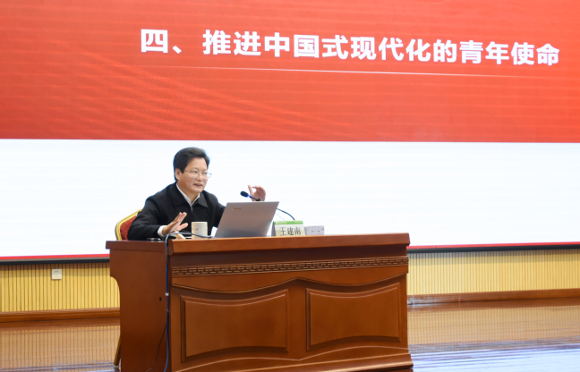 王建南从中国式现代化是党领导人民独立自主探索开辟出来的成功道路、中国式现代化创造了世界现代化发展新模式、中国式现代化是中国共产党领导的社会主义现代化、推进中国式现代化的青年使命4个方面,深刻阐释了中国式现代化的发展历程、科学内涵、理论创新、实现路径、青年使命,引导青年师生深入学习贯彻党的二十大精神,深刻认识把握中国式现代化是我们党领导人民在长期探索和实践中历经千辛万苦、付出巨大代价取得的重大成果,深刻认识把握概括提出并深入阐述中国式现代化理论是党的二十大的一个重大理论创新,我们必须倍加珍惜、始终坚持、不断拓展和深化。