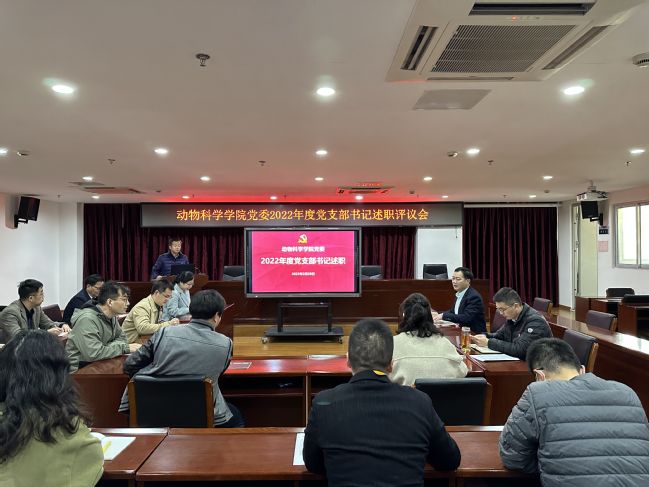 近日,动物科学学院党委在圣农新动科楼大会议室召开2022年度党支部书记述职评议会。学院党委领导班子成员出席会议,各党支部书记参加会议。会议由院党委书记陈为德主持。