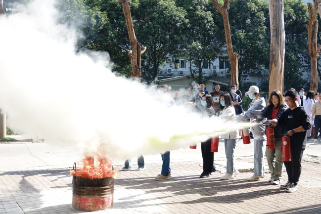 演练环节通过模拟小型火灾现场使用灭火器材开展自救过程,练习灭火器的操作和使用。现场还通过安全知识展板等,围绕实验室危化品安全、消防安全、水电安全、特种设备安全等开展实验室安全宣传。