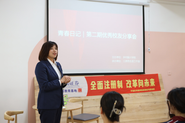 3月11日下午,乡村振兴学院在北区生活驿站举行青春日记第二期优秀校友分享会暨华福证券专场招聘会。华福证券福州分公司江滨中大道营业部总经理、2000级农村区域发展专业校友王宁受邀出席分享会,学院党委副书记陈玲凤、全体辅导员及学院30名学生参加分享会。